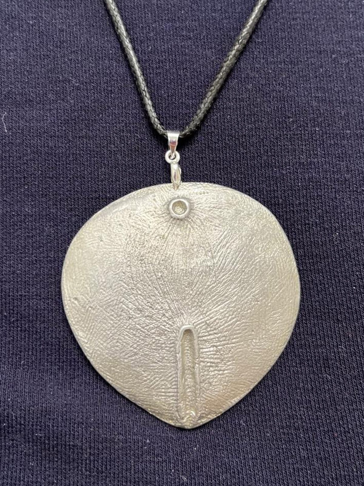 The necklace comes on a black cord. It is a signed limited edition of 20 and comes in a gift box.
